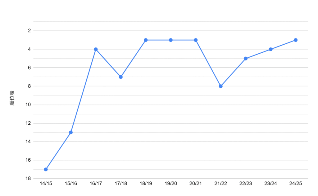 という印象。(国内リーグ3位が4回、カップ戦準優勝が3回)